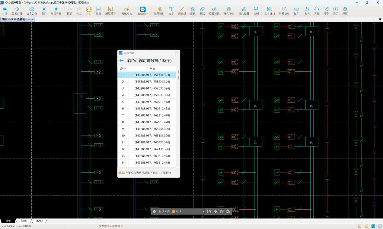 楼宇对讲系统清晰分类安装,用CAD快速看图做工程计量!一键查找“DJ”,再用图形识别功能框选,设备数量立马算得明明白白,可视化对讲系统工程量轻松搞定!