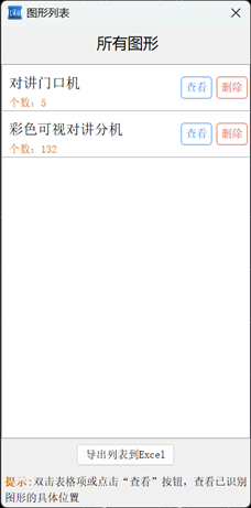 以楼层对讲分支箱为例,使用软件的【文字查找】功能,查找内容为“DJ”,得到全图34处标记,分别材料表1处、系统图32处、详图1处,则得工程量为32。接着使用【图形识别】功能,识别系统图中的对讲门口机和彩色可视对讲分机,查找范围选择矩形区域查找,框选系统图,点击开始识别,得到工程量分别为5和132.