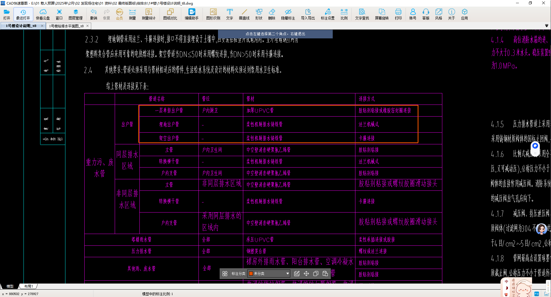 1、结合设计说明,用CAD快速看图形状命令标注出来铸铁管使用位置,便于后期查看