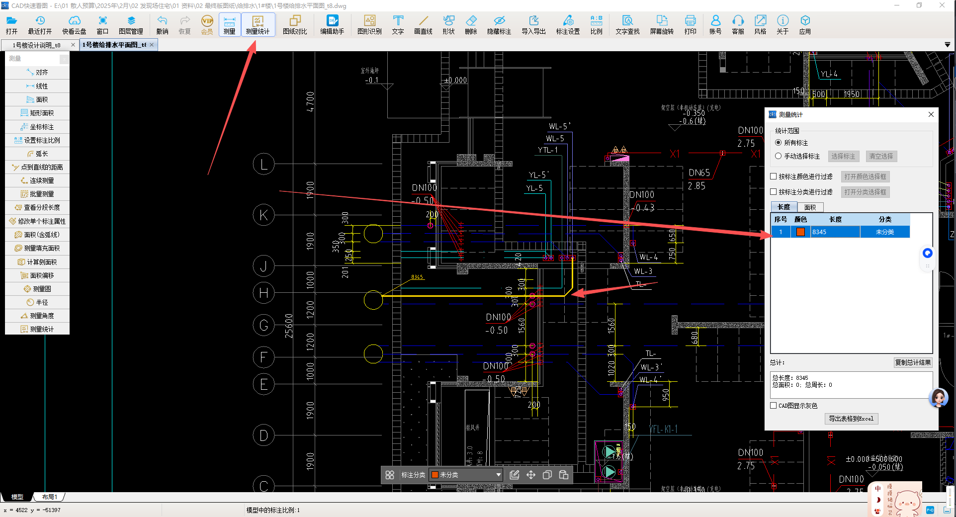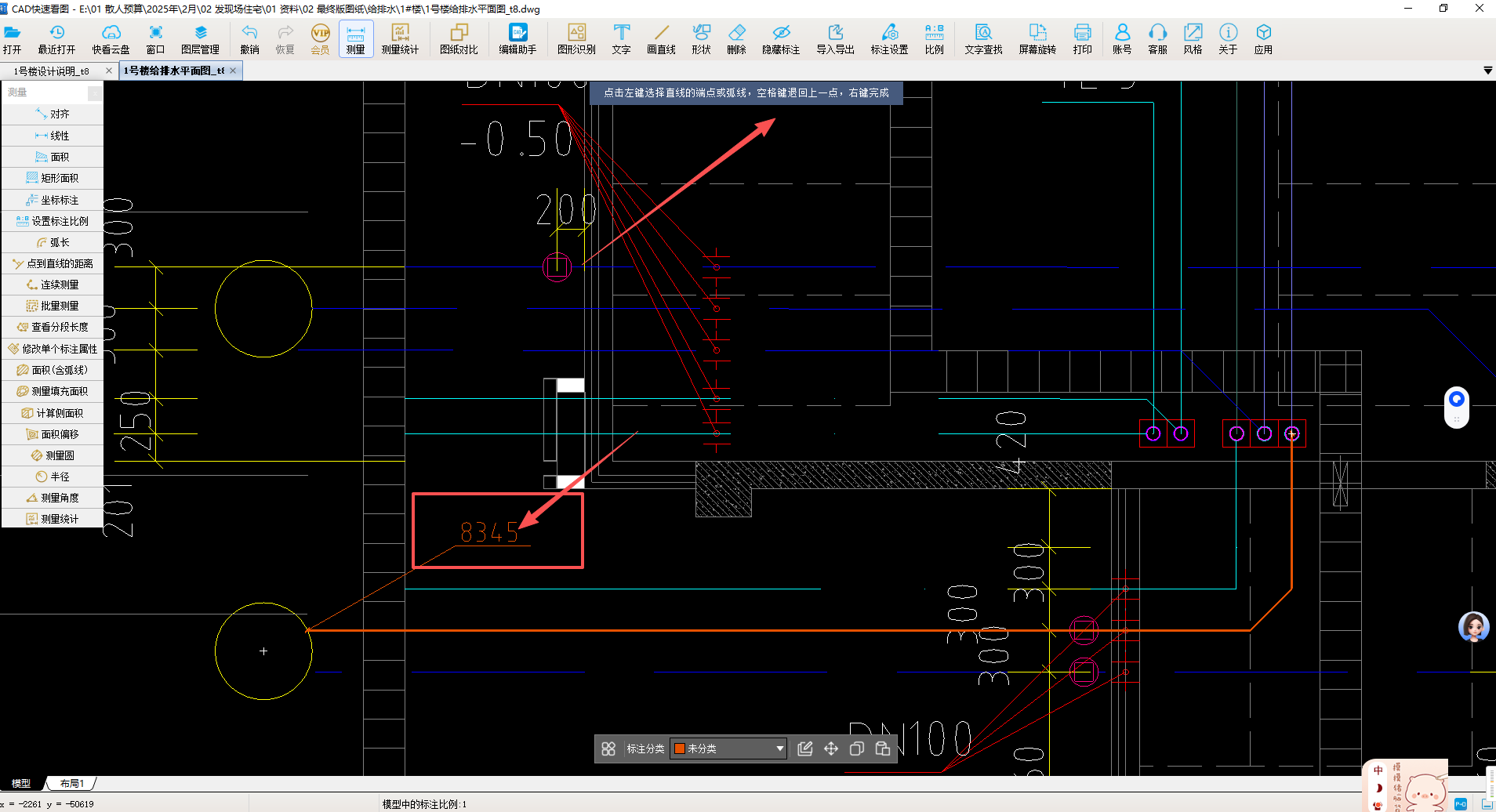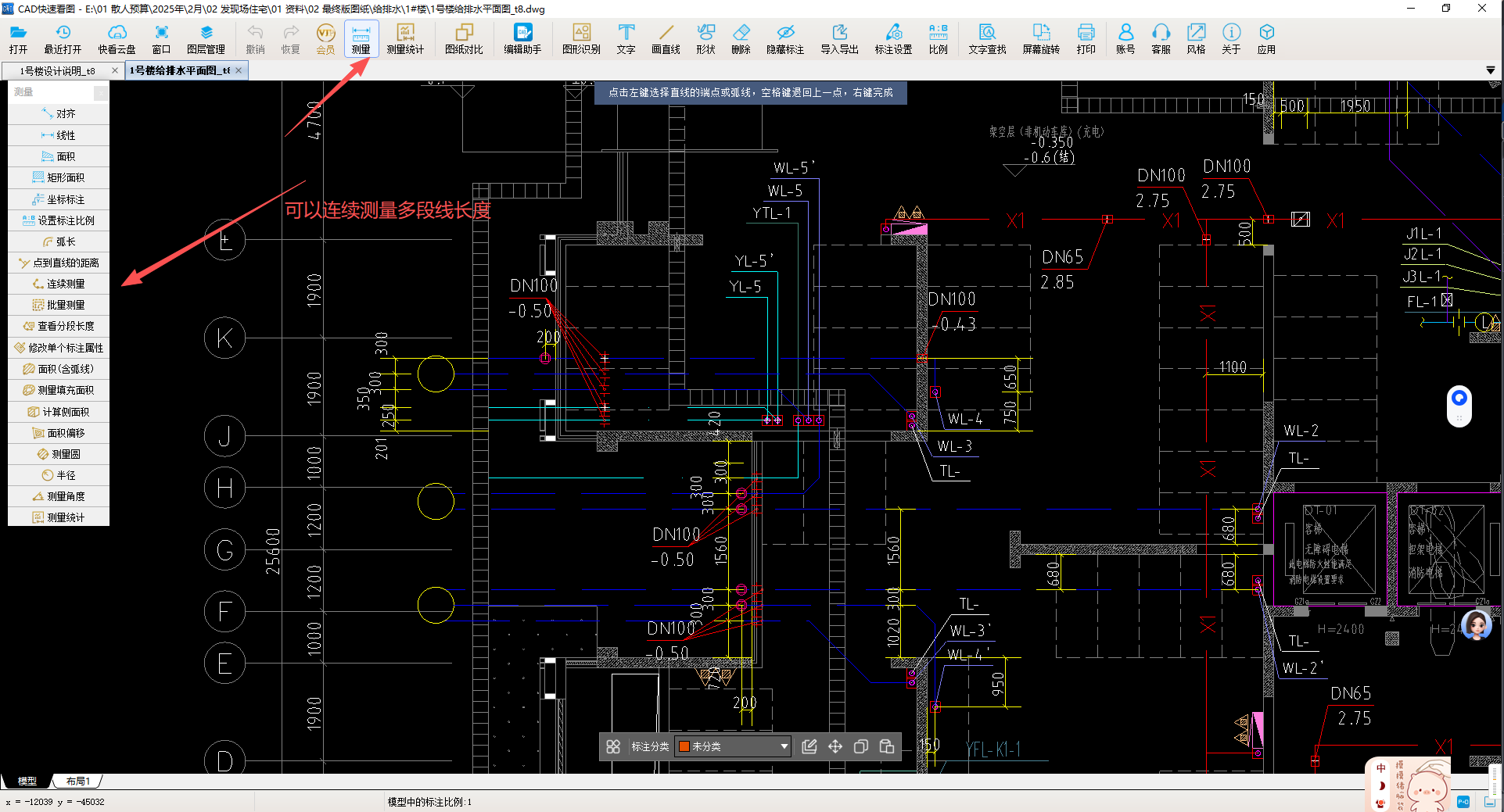 2、找到平面图对应位置,用测量命令中的连续测量进行工程量计算。本案例排水管计算至室外第一个污水检查井,管道规格为DN100,材质为柔性机制铸铁排水管。
