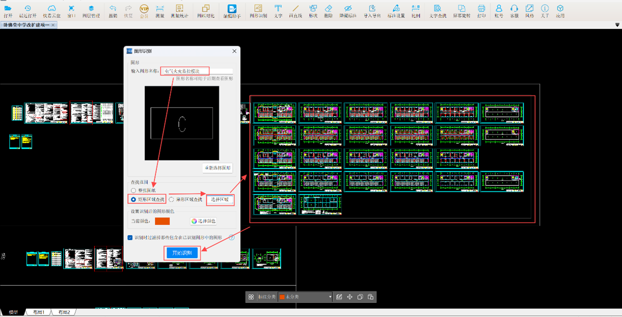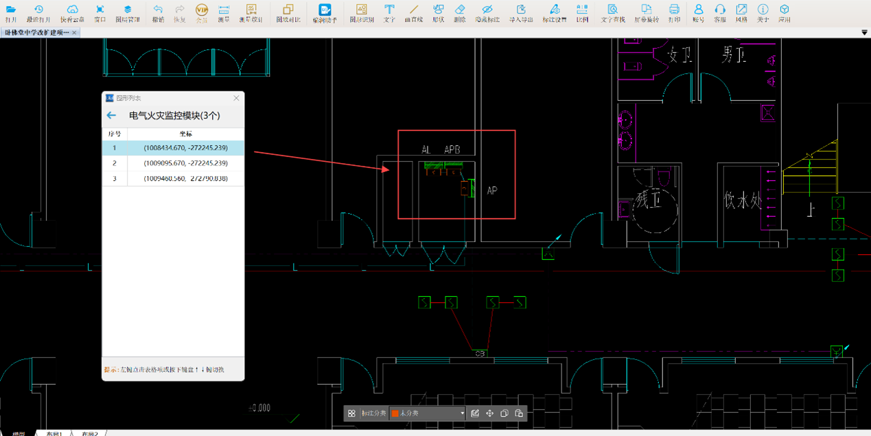 2.在CAD快速看图中,点击【图形识别】功能,选框图例后,在任意位置右键确认选择。确认图例无误后,输入图形名称,以便后续查阅。将查找范围设置为矩形区域查找,框选全部电气平面图并开始识别。这样即可迅速定位电气火灾监控模块的位置,并统计其数量为3个。