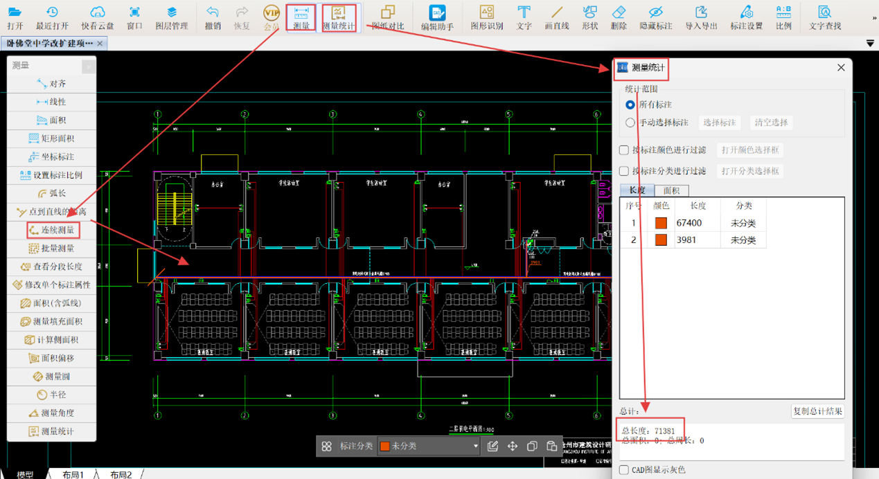 2. 计量水平线槽工程量时,点击CAD快速看图软件测量选项中的【连续测量】,沿图示标注线槽后右键完成操作。如图所示,线槽水平工程量为71.381米。