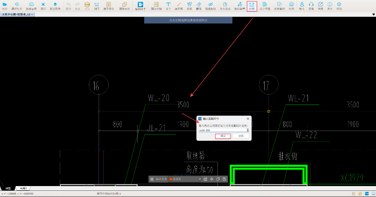 2. 在开始计量前,首先需调整比例。利用CAD快速看图中的【比例】功能,量取任意线段并输入实际尺寸。计算卫生间给水管水平管时,需结合公共卫生间给排水管道轴测图一同查看,此时可使用【图纸对比】功能,便于观察给水管管径的变化。
