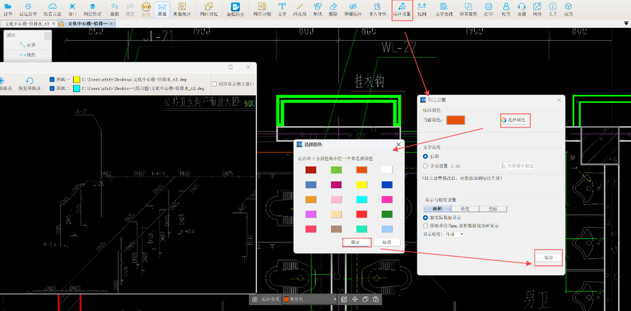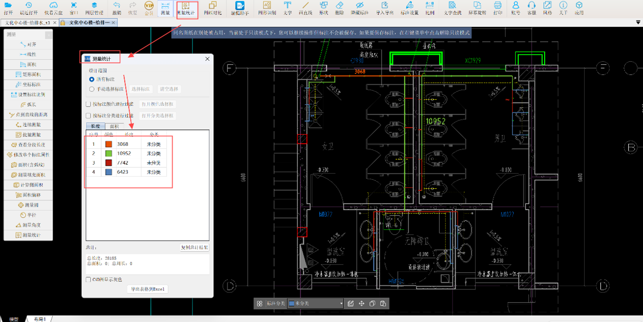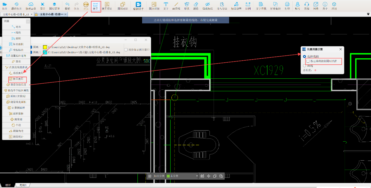 3. 通过CAD快速看图的【测量】中的【批量测量】功能,勾选“按已选线段的图层过滤”,将相同管径的给水管标注出来,右键结束标注并实时计算。为区分不同管径的给水管,可使用【标注设置】功能,用不同颜色标注不同管径,便于后续统计。