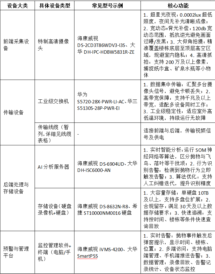 一套能稳定运行的高空抛物监控系统,不是单一设备在“单打独斗”,而是多个设备协同作战,每个部分都有不可替代的作用: