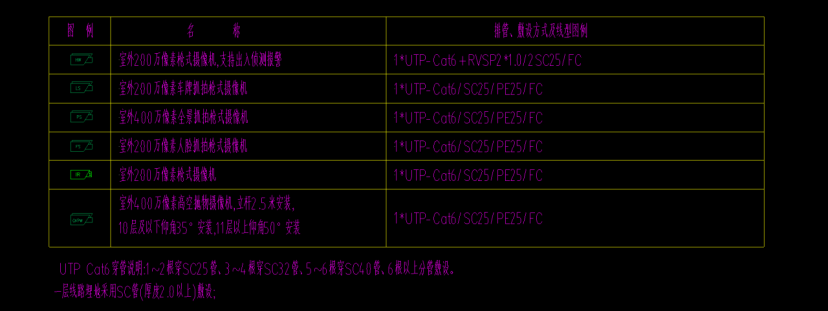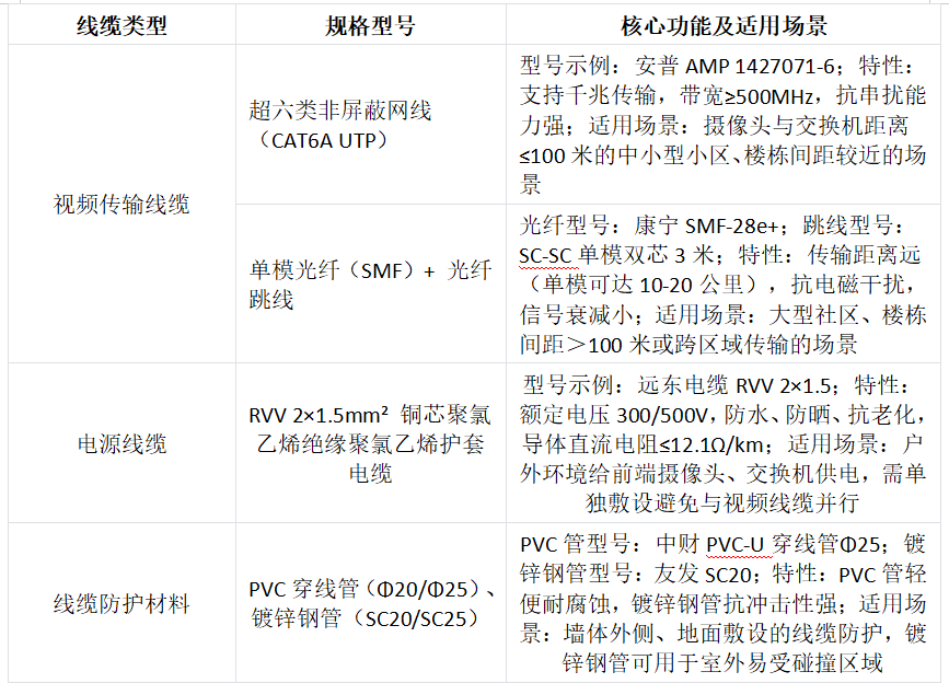 通过表格可清晰看到各设备的核心信息,不同场景下可根据楼栋规模、环境需求调整设备选型。除设备外,线缆作为系统的“血脉”,其规格型号直接决定传输稳定性,具体参数如下表: