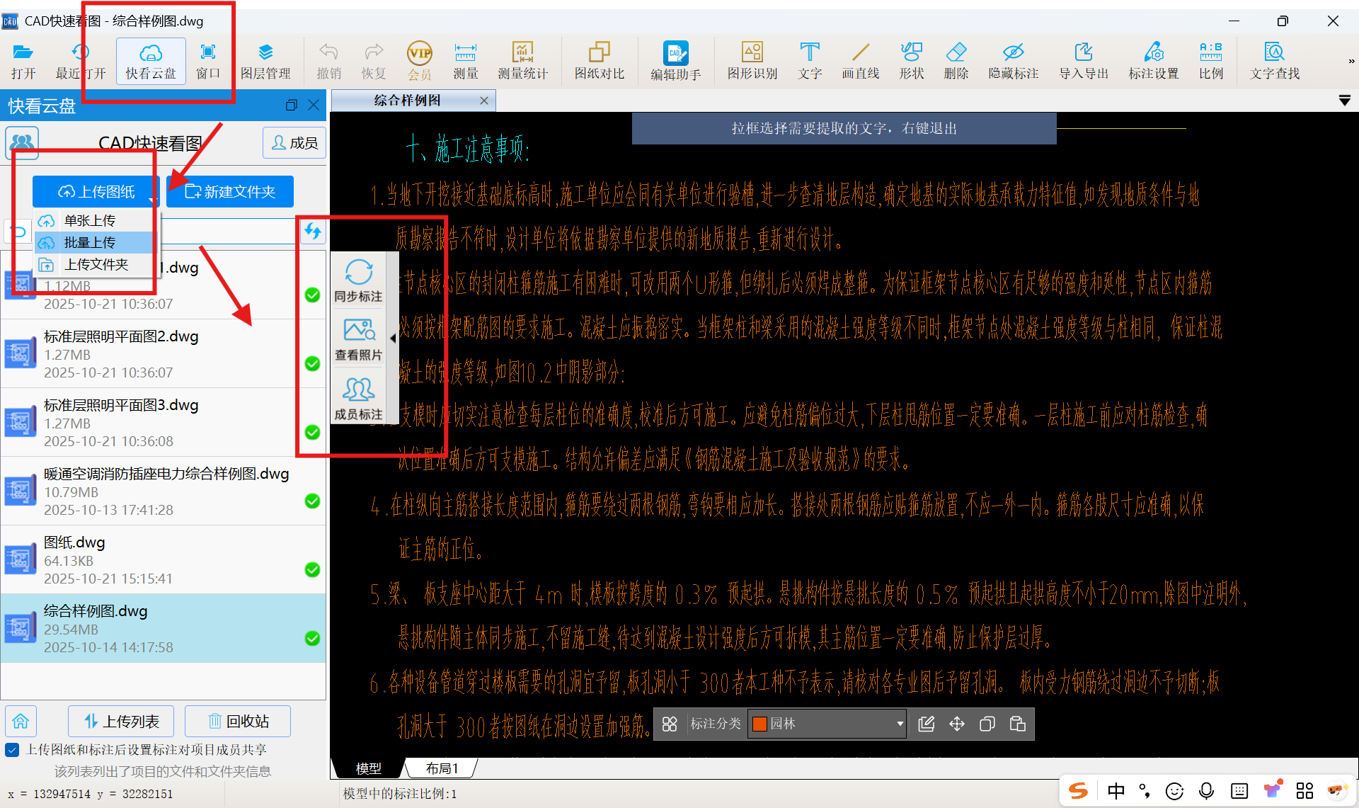 第二步批量上传图纸更省心。以前传图纸要一张张核对版本,现在直接选中本地文件夹里的图纸拖进云盘就行,甚至天正图纸也能直接上传。