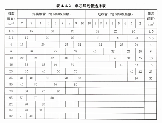 (9)单芯导线穿管时,管道外径尺寸参见表4.4.2。