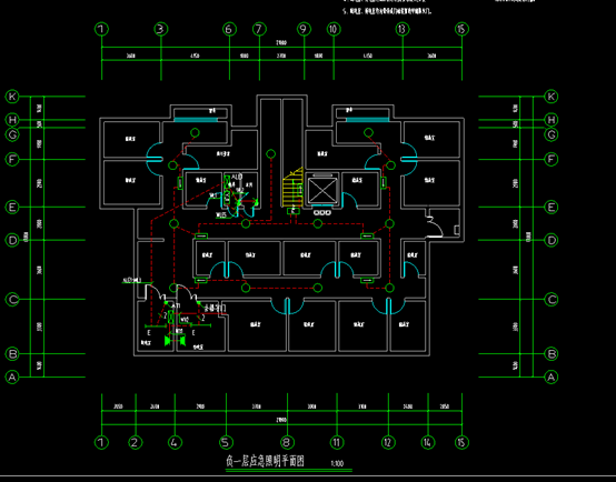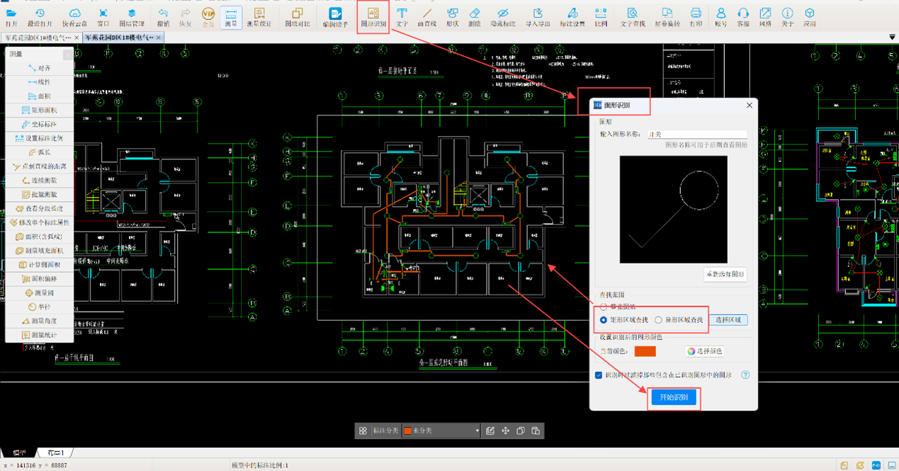 3. 为方便竖向配管计算,点击CAD快速看图中的【图形识别】功能,框选图例后右键点击,输入名称“开关”,再选择查找范围为负一层应急照明平面图,确认无误后即可开始识别。A型单向疏散指示标志灯的识别方法与此类似。