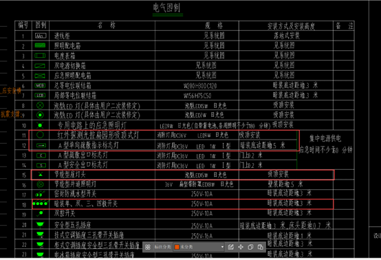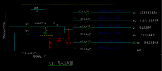1. 观察负一层应急照明平面图、电气图例及ALE1配电系统图,配管采用JDG20-CC/WC,ALE1配电箱底边距地1.3米,尺寸为280x460x90。