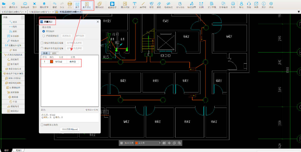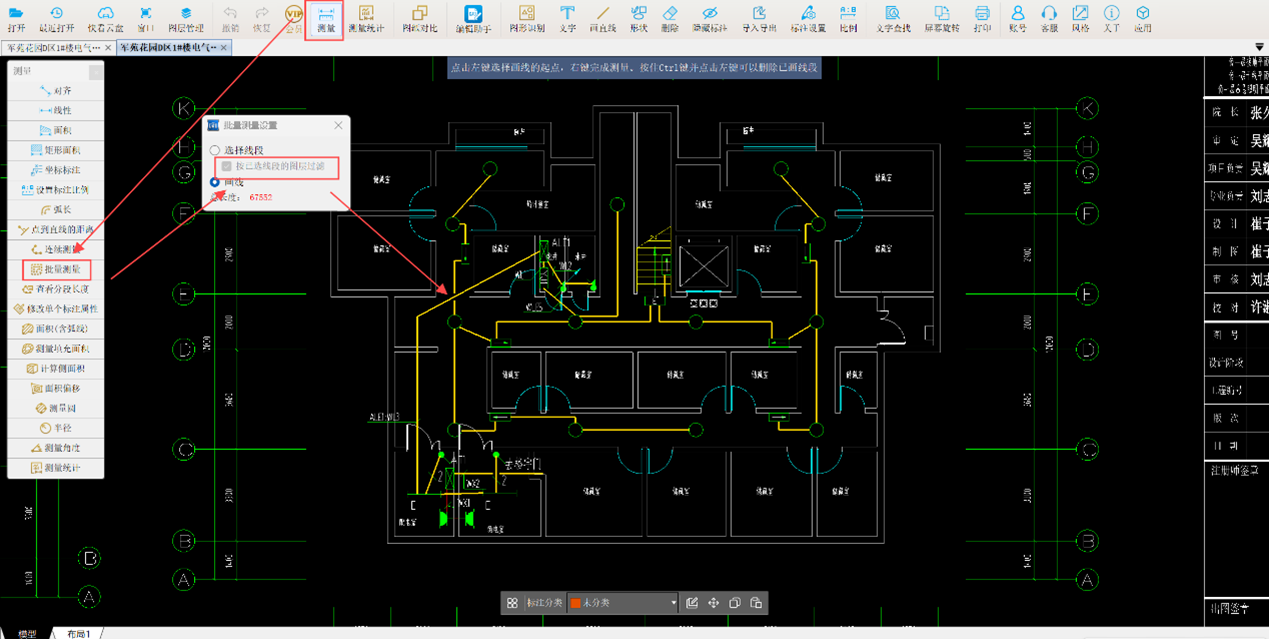 2. 使用CAD快速看图软件的【批量测量】功能,选择线段,单击点选照明回路上的管线,此时软件将亮显为金色,勾选“按已选线段的图层过滤”后右键确认。如图所示,负一层应急照明回路水平配管长度为67.552米。
