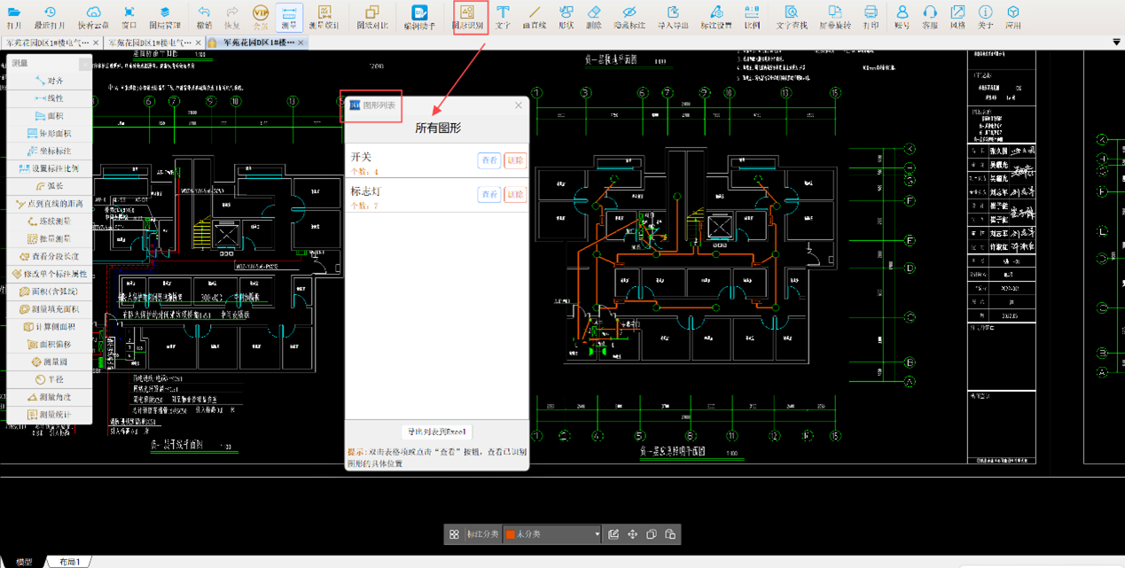 所有照明器具识别完成后,可通过【查看已识别图形列表】功能统计所有照明器具数量,如图所示:A型单向疏散指示标志灯7个,开关4个。