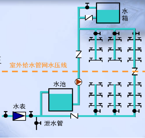 适用场所:水量、水压在一天内均能满足用水要求的用水场所。