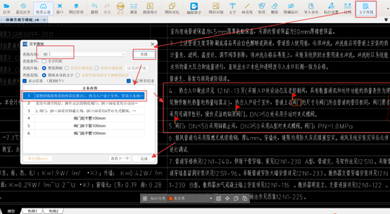 2. 使用CAD快速看图【文字查找】功能,输入关键词“阀门”,并将查找范围设定为施工总说明,快速锁定阀门材质、规格等关键信息。