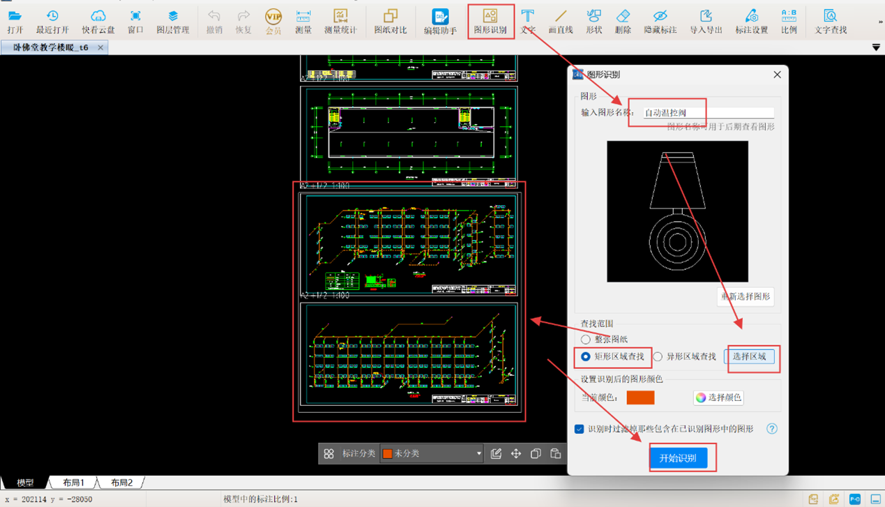 3. 点击CAD快速看图的【图形识别】功能,先框选自动温控阀图例,右键点击并输入图形名称“自动温控阀”,将查找范围设定为采暖系统图(一)和采暖系统图(二)。确认无误后开始识别,系统会自动筛选出所有自动温控阀并统计数量,其他阀门计量方法相同。