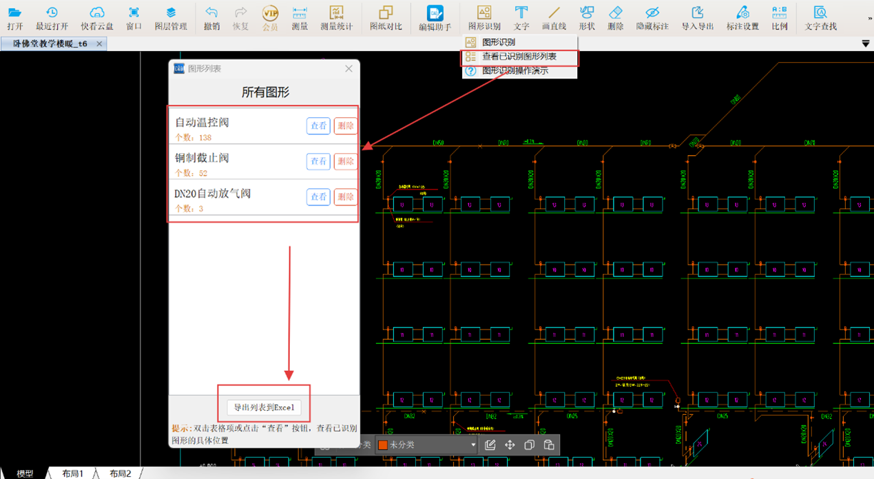 所有阀门识别完成后,使用【查看已识别图形列表】统计所有阀门数量,并可汇总至Excel表格,便于工程量清单编制。