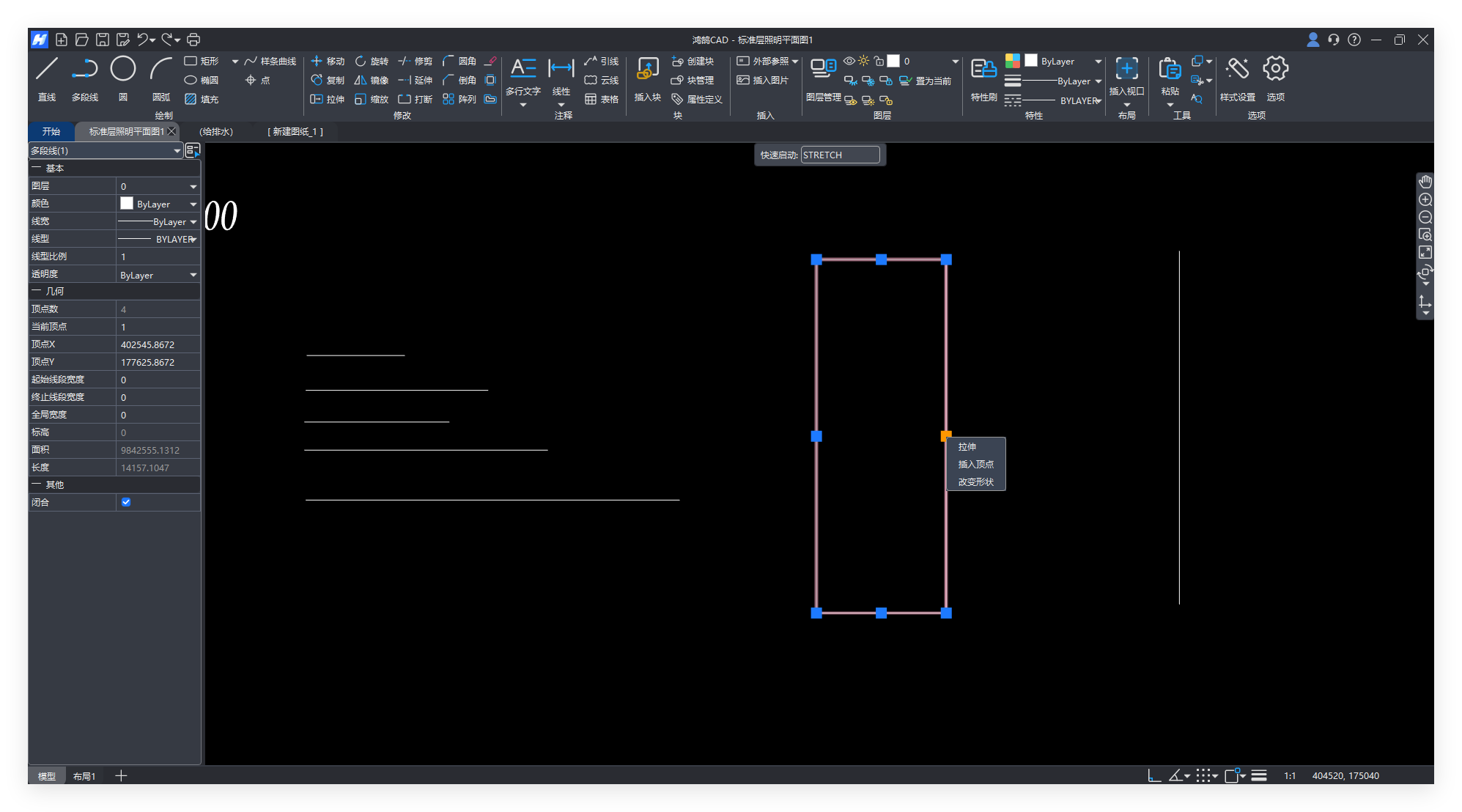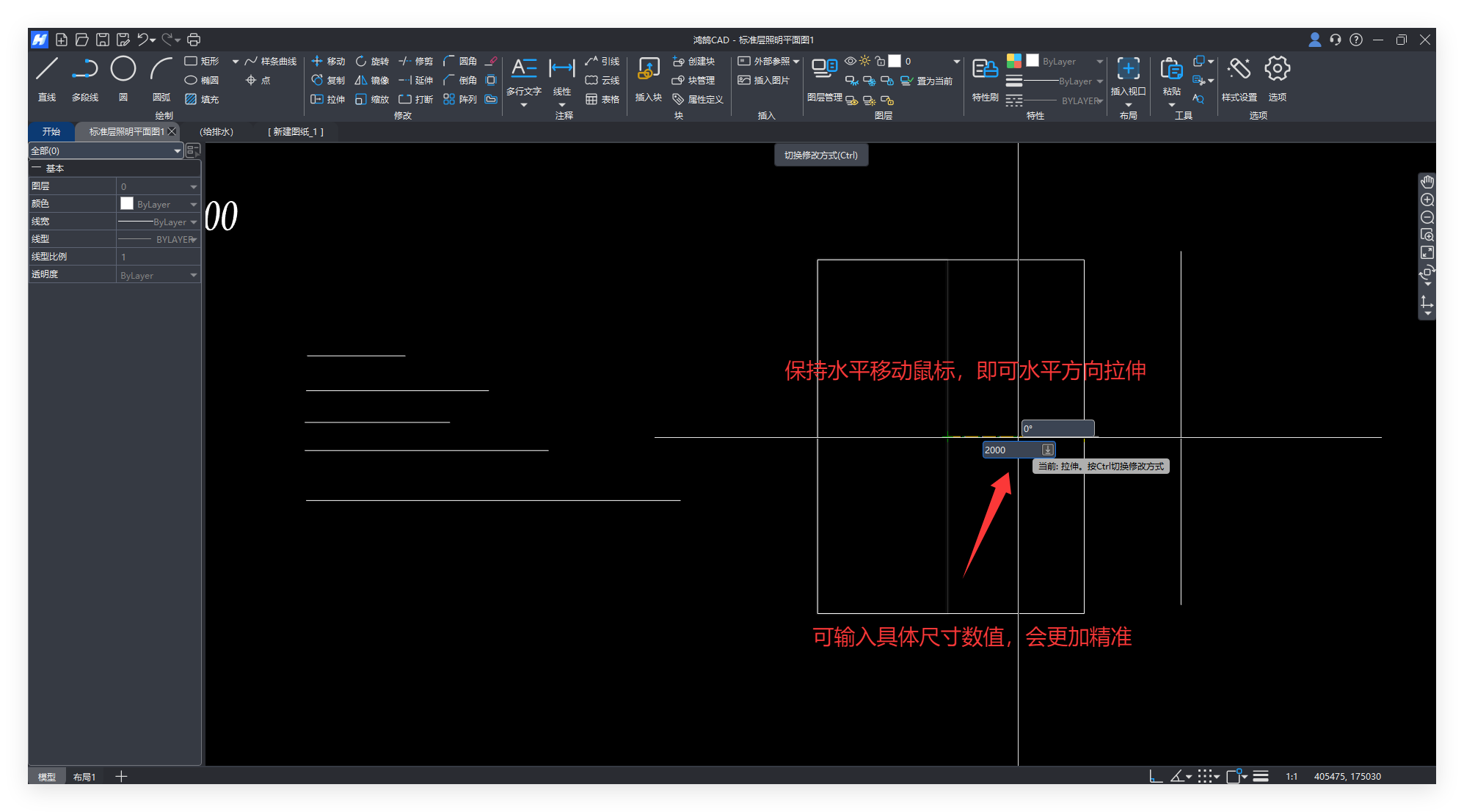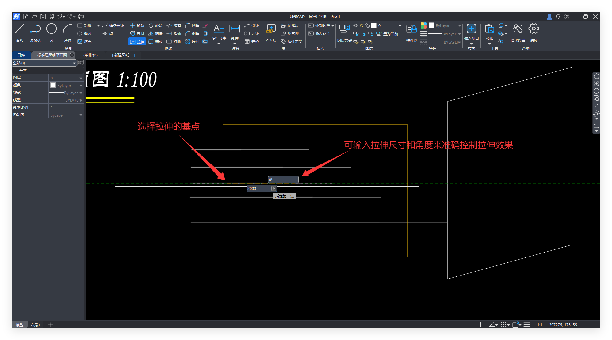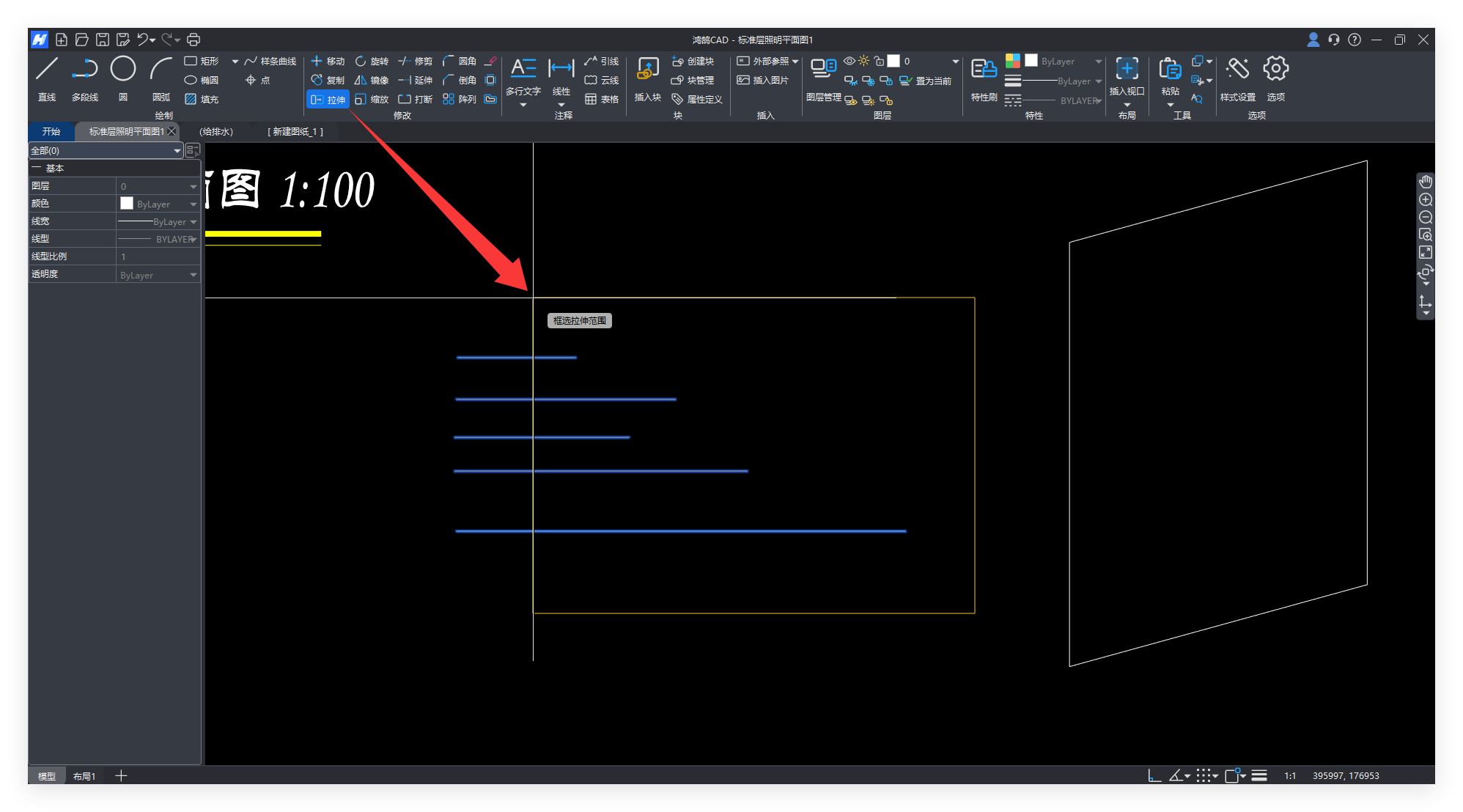 图形用【拉伸】,线条可以用【拉伸】或【延伸】,延伸下一个技巧讲解,我们先来看批量拉伸。