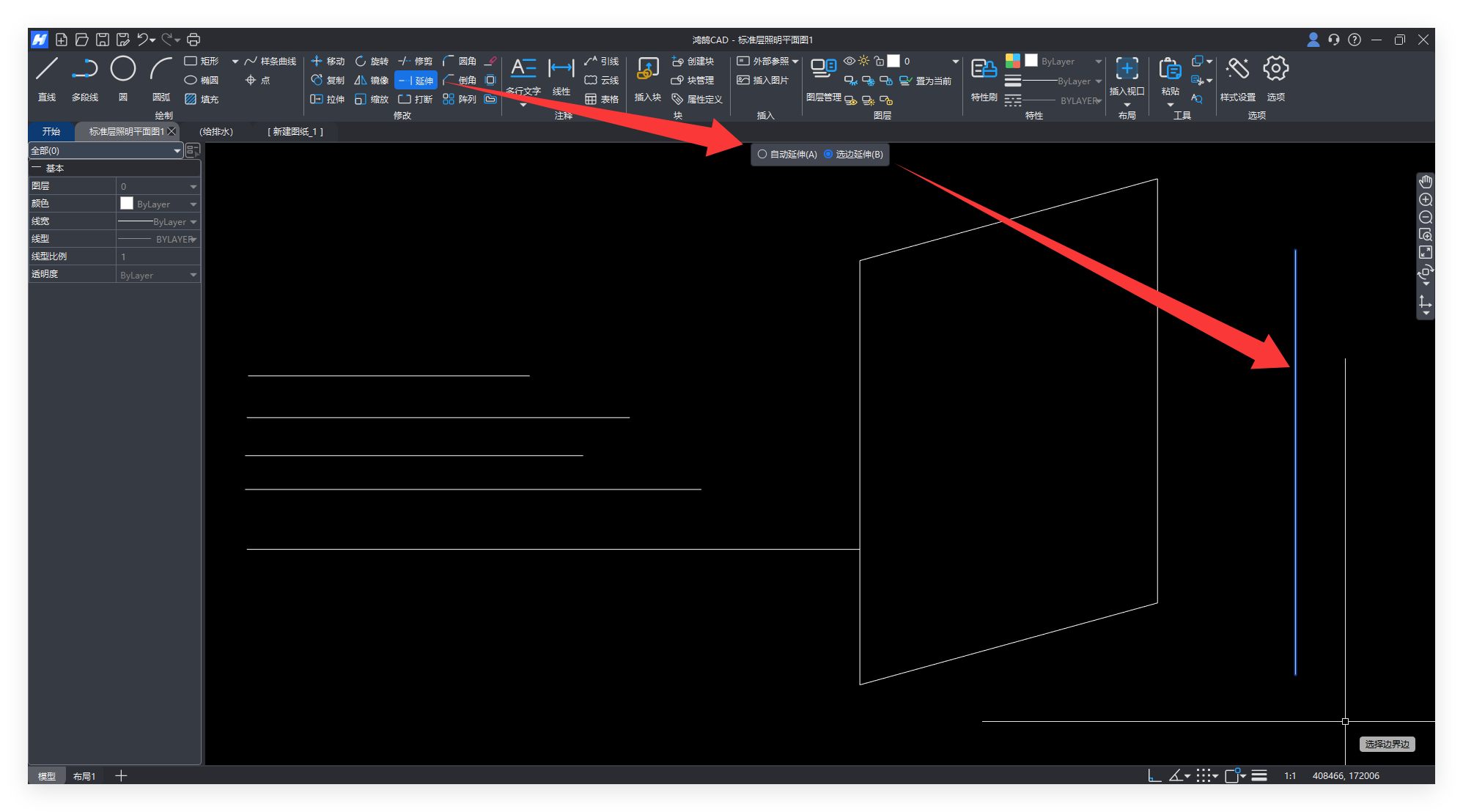 就用鸿鹄CAD左上角的【延伸】,勾选“选边延伸”,选中右边竖线作为延伸边界线,回车确认。