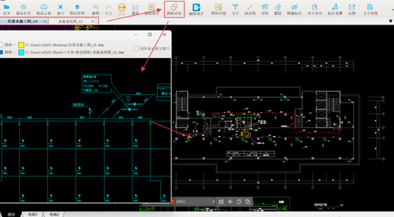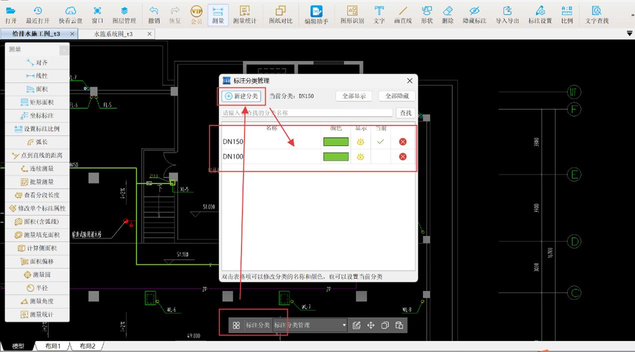 2.为清晰辨识管径变化,可运用CAD快速看图软件的【图纸对比】功能同步显示平面图与系统图。同时为分别统计DN100与DN150管径的消防栓钢管,点击【标注分类管理】新建两种标注类型,设置差异化颜色或名称进行区分。