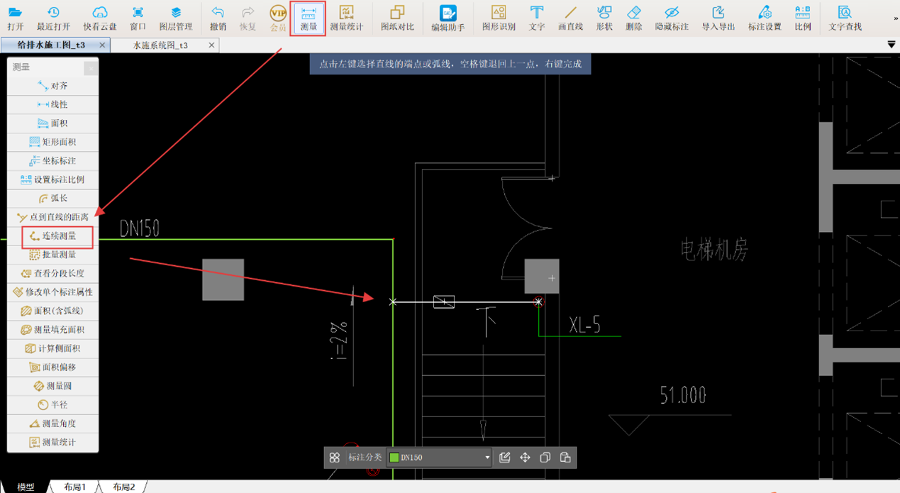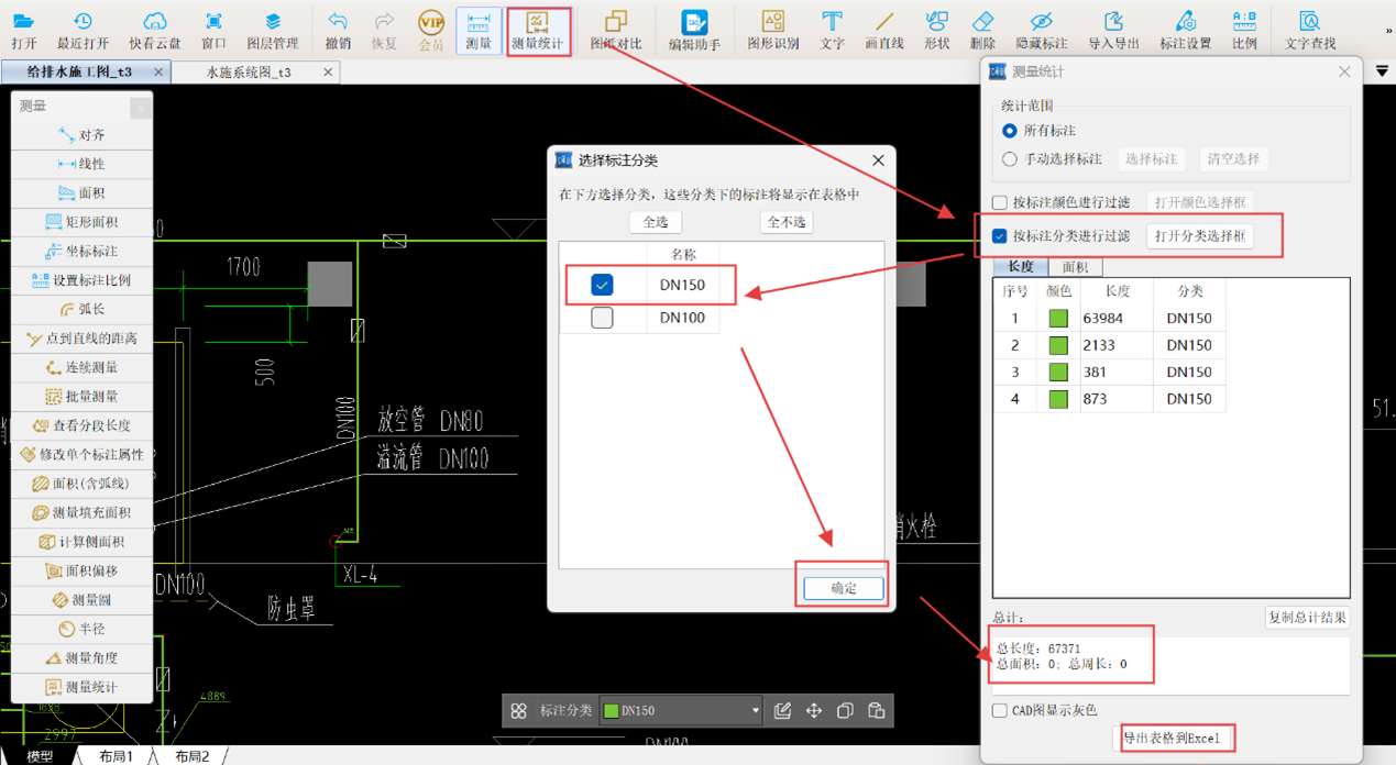 3. 水平消防栓钢管计算:使用【连续测量】功能沿设计管道中心线标注,完成后点击右键自动生成线段长度标注。待所有管道标注完毕,启用【测量统计】功能,按标注分类筛选(如图所示),得DN150:67.371m,DN100:35.618m。