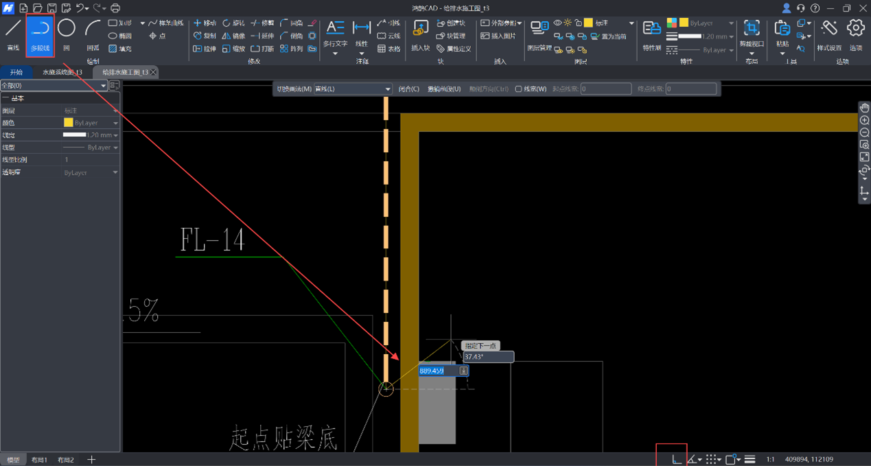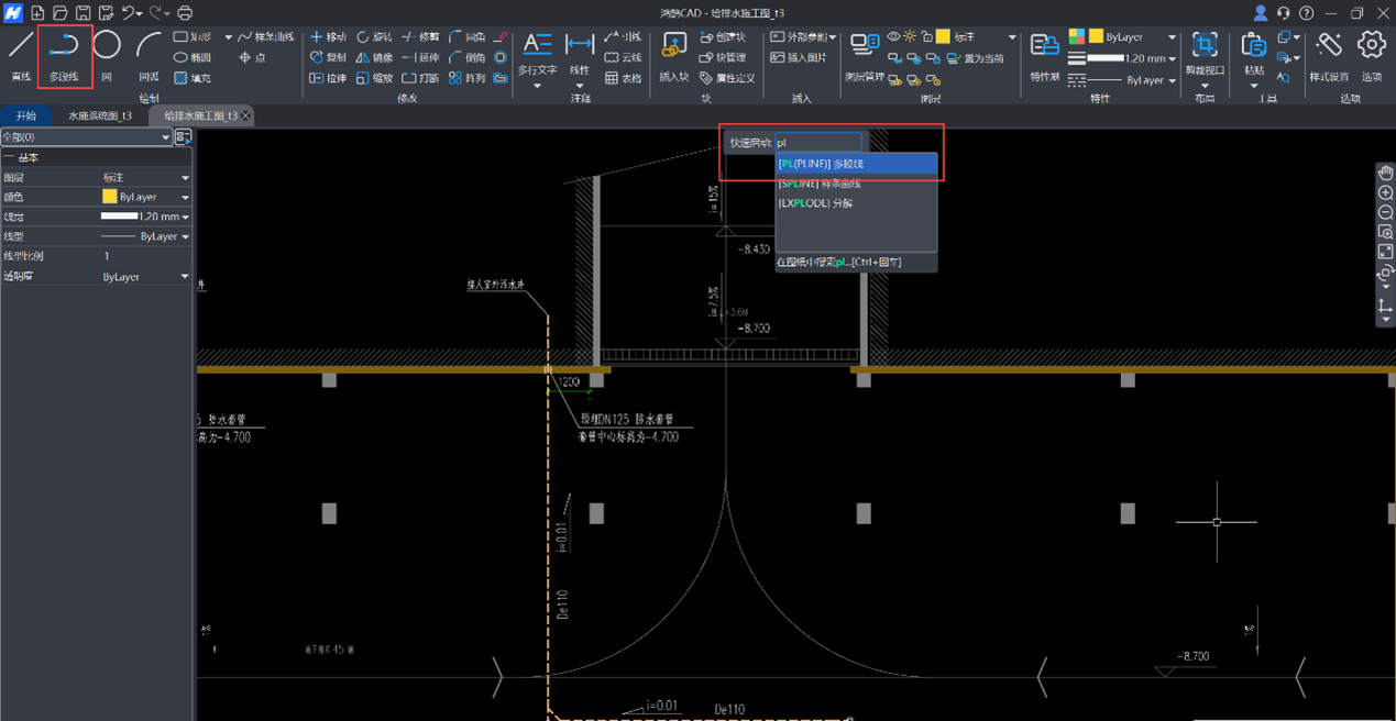 接下来,以De110排水管为例,输入命令【PL】或点击【绘制】菜单中的【多段线】命令,并借助右下角的【正交】功能,提升绘制的便捷性。绘制完成后,按“esc”快捷键退出命令。
