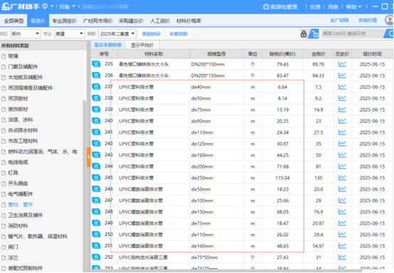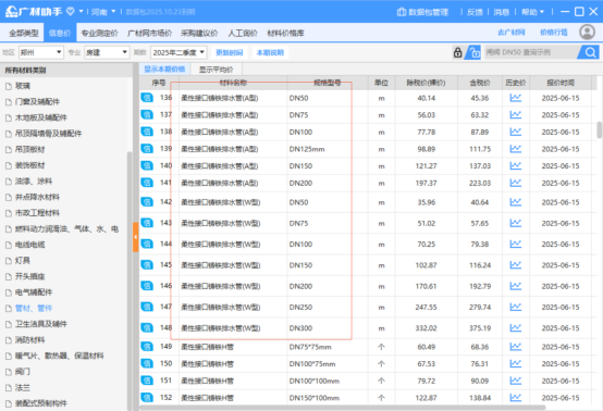 先上一波信息价目表,排水管有普通UPVC、消音管、PVC-U、A型铸铁,W型铸铁等等等,结合图纸设计的管材分类和信息价,结合CAD快速看图连续测量计算排水管材工程量~