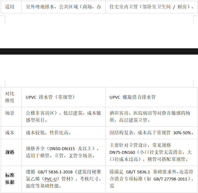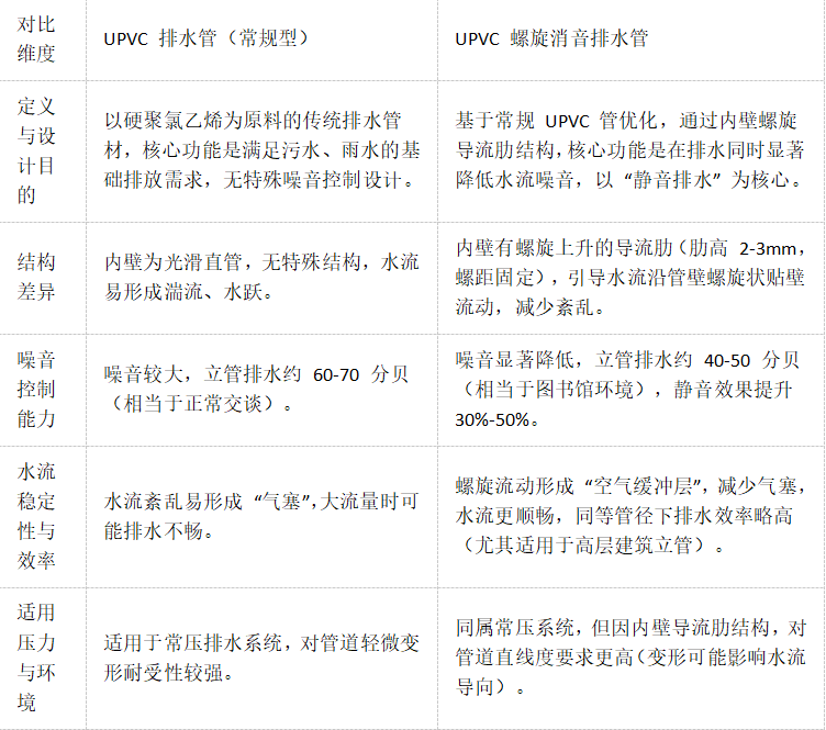 2.3.1、管道具有,优异的消音性能。管内壁的螺旋肋条使水流呈螺旋状贴壁流动,减少了空气涡流,相比普通 UPVC 排水管,降低噪音效果明显,尤其适合医院,卧室等环境需求高的场景。