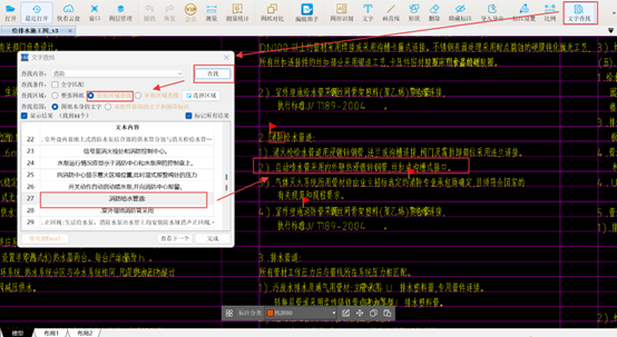 1. 观察11-12层消防平面图及喷淋系统图时,通过CAD快速看图软件的【文字查找】,在设计说明部分输入"消防"或"自动喷淋"等关键词,点击查找即可定位所有相关内容。