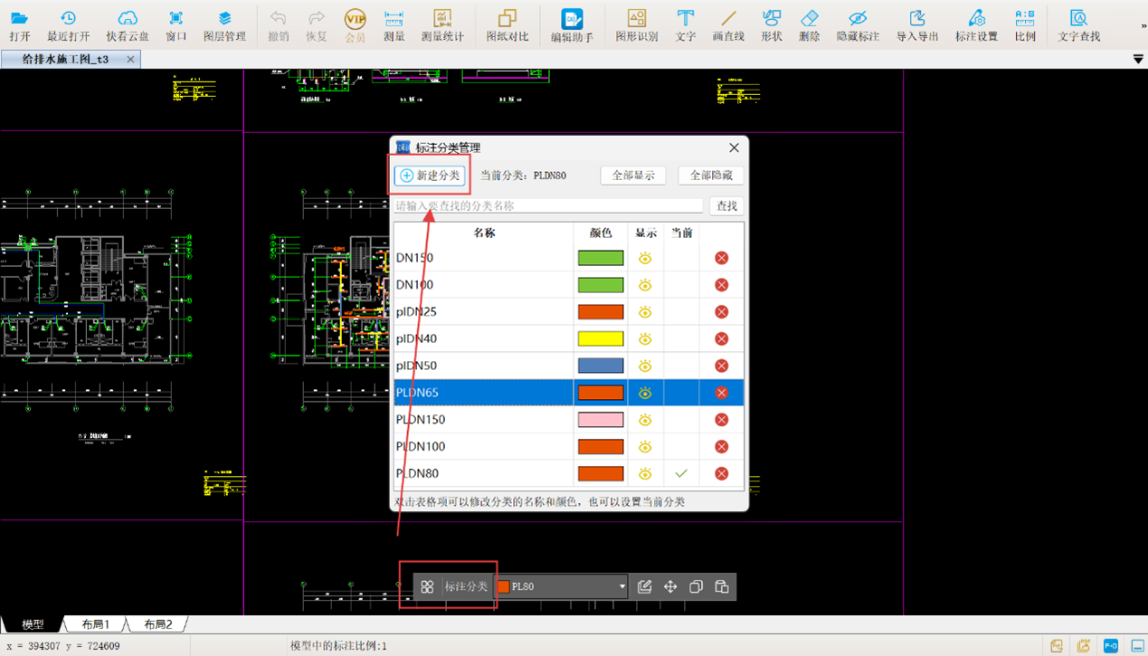 2. 计算水喷淋钢管前,运用【标注分类管理】功能新建分类,以不同颜色和名称区分管径规格,为后续统计奠定基础。