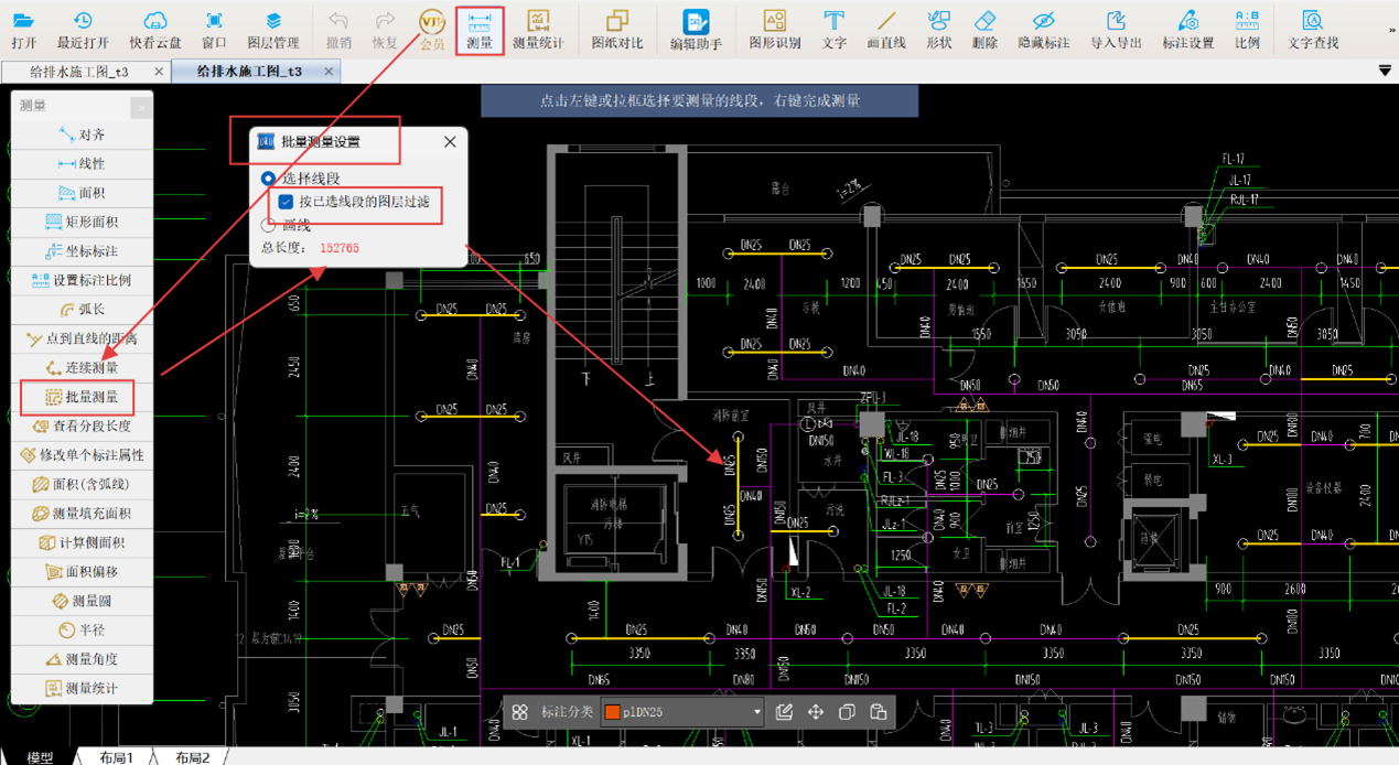 随后启用【测量】中的【批量测量】,勾选"按已选线段图层过滤"后点选水喷淋钢管(需确保图纸管径标注与【标注分类管理】中的命名一致),右键即可完成测量并标注。