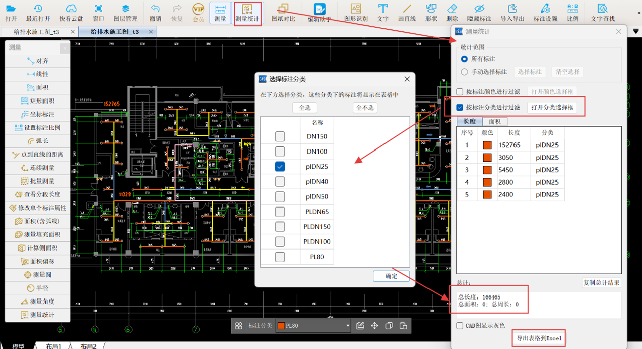3. 完成水平水喷淋钢管测量后,通过【测量统计】功能按标注分类过滤数据。如图所示,其中DN25水平水喷淋钢管工程量为166.465m,统计结果可直接导出至Excel表格。