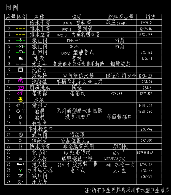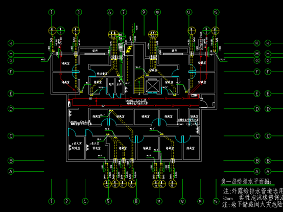 1.观察负一层给排水平面图,其中灭火器种类为MF/ABC3(2A)2具磷酸铵盐干粉灭火器。
