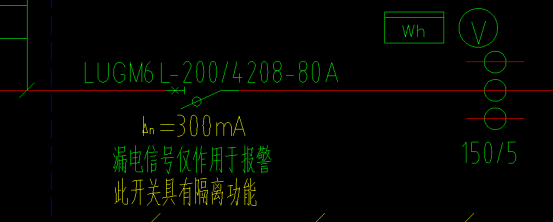 塑壳断路器各部分标注含义解析(下图所示):LUGM6L-200/4208-80A 是带漏电功能的 4 极塑壳断路器,其壳架电流为 200A、额定工作电流 80A,采用热磁脱扣方式实现过载与短路保护;图纸标注它的额定剩余动作电流 IΔn=300mA,