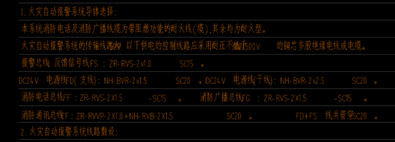 1.观察标准层火灾自动报警平面图、火灾报警系统图、电气图例、设计说明,其中包括FD:DC24V电源二总线(NH-RVB-2X2.5 JDG20)和FS:信号二总线(ZN-RVS-2X1.0 JDG20),以信号二总线为例,配管为JDG20-CC。