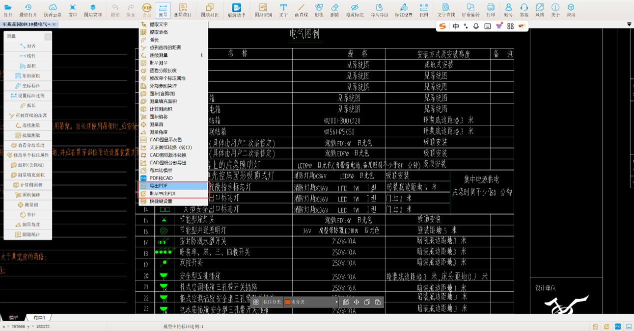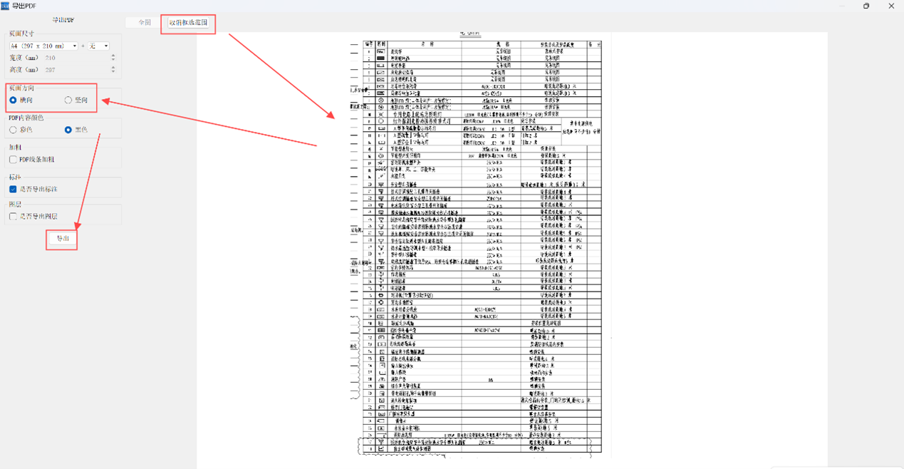 2. 为便于统计消防器具并计算竖向配管,可借助CAD快速看图会员的【导出PDF】功能,将材料表导出为PDF文件。在导出过程中,需特别注意框选范围、页面尺寸及PDF内容颜色,具体效果图请参见上图。