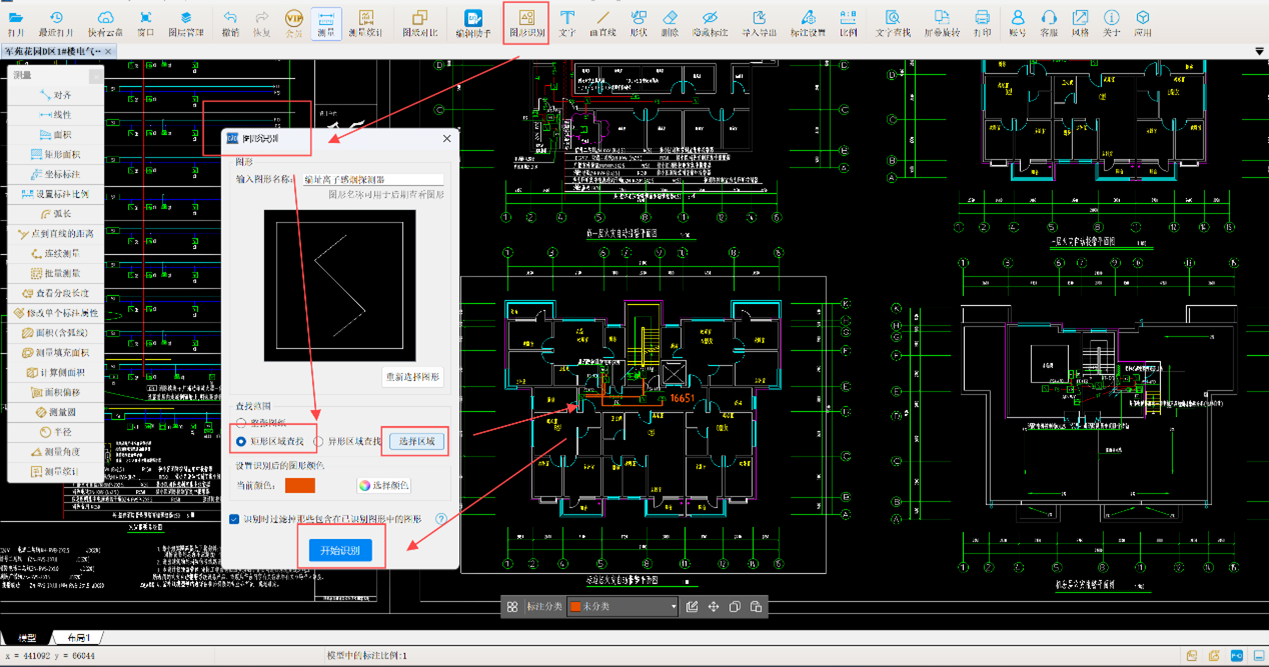 3. 以编址离子感烟探测器为例,利用CAD快速看图中的【图形识别】功能,框选图例后右击确认;确认图例无误后,输入图形名称以便后续查询;设置查找范围为矩形区域,框选标准层火灾自动报警平面图后开始识别。