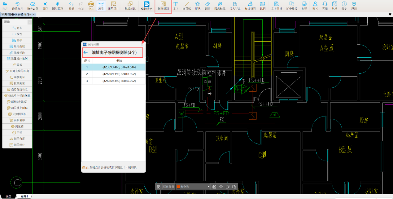 其他消防电器具的识别方法与此相同。待全部识别完成后,通过【查看已识别图形列表】功能,可快速统计并查询所有消防电器具。本案例中,编址离子感烟探测器共3个,带电话插孔的手动报警按钮1个,消火栓起泵按钮1个。