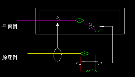从配电箱引来三根线,分别是火线(红色),零线(蓝色),底线(黄色),火线经过灯具,但是不接入灯具,直接进入单联开关,与开关接线柱连接,零线,底线接入灯具,从开关处接出一根控制线接入灯具,用于控制灯具的亮和灭。这也就是第一段线标注为3根线,第二段线标注为2段线的原因。