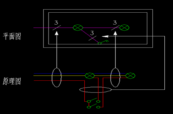 从配电箱引来三根线,分别是火线(红色),零线(蓝色),底线(黄色),火线经过灯具,但是不接入灯具,直接进入双联开关,与开关接线柱连接,零线,底线接入灯具,从开关处接出2根控制线分别接入2个灯具,用于控制灯具的亮和灭。这也就是没短线段线标注为3根线的原因,虽然根数一样,但是线的类型不同,第一个3根线处是零线,地线,火线;中间三根线是一根火线,两根控制线;第三个3根线是一根火线,两根控制线。
