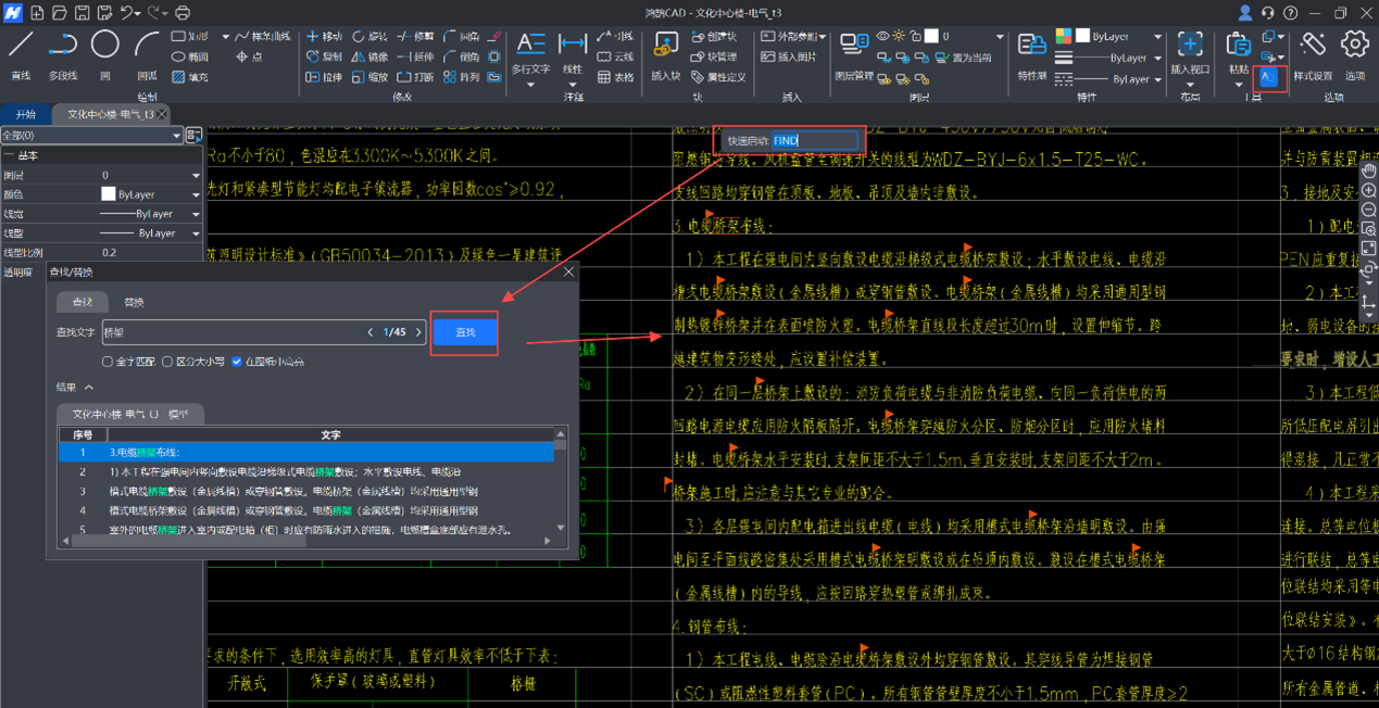 2. 为明确桥架材质,可以使用鸿鹄CAD中的【FIND】命令或【工具】菜单下的【查找】功能,输入关键词“排水管”,点选查找即可快速定位到排水管的设计说明。