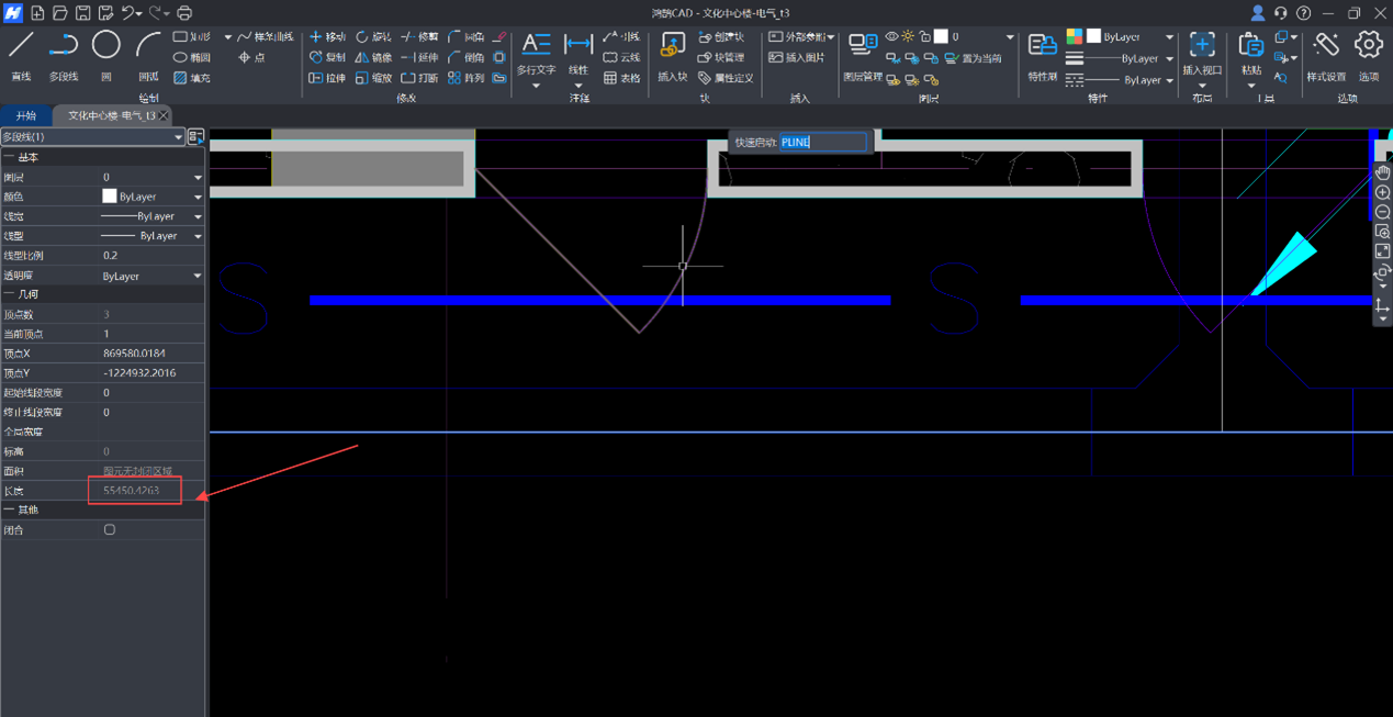绘制完成后选中多段线,便可在属性页面中查看桥架水平工程量。本案例中,水平桥架工程量为68.83米。