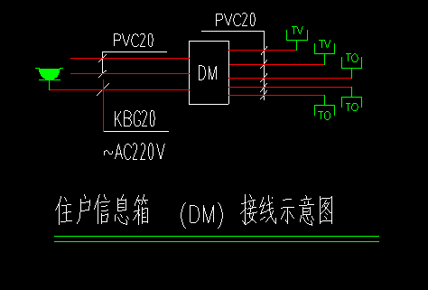 1.观察住户信息箱(DM)接线示意图、一层弱电平面图,本案例以B户型为例。DM室内分配箱320x210x150,距地0.3米,管井内箱体距地0.5米,配管为PVC20-FC。