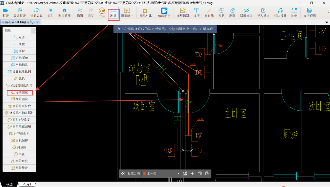 有线电视系统配管计量,借助CAD快速看图的【连续测量】进行高效测量,实现自动累加计算,有效避免传统分段测量的繁琐与误差,提升弱电配管工程量计算的效率与精度。