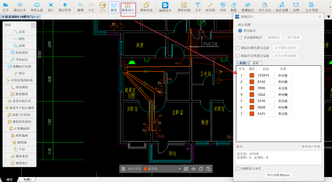 2. 依次点击CAD快速看图【测量】与【连续测量】,依设计图示标注配线路径,右键结束命令后自动生成标记长度。完成B户型有线电视系统配管后,用【测量统计】,如附图所示,水平接闪带工程量为157.378m,并支持导出Excel工程量汇总表。
