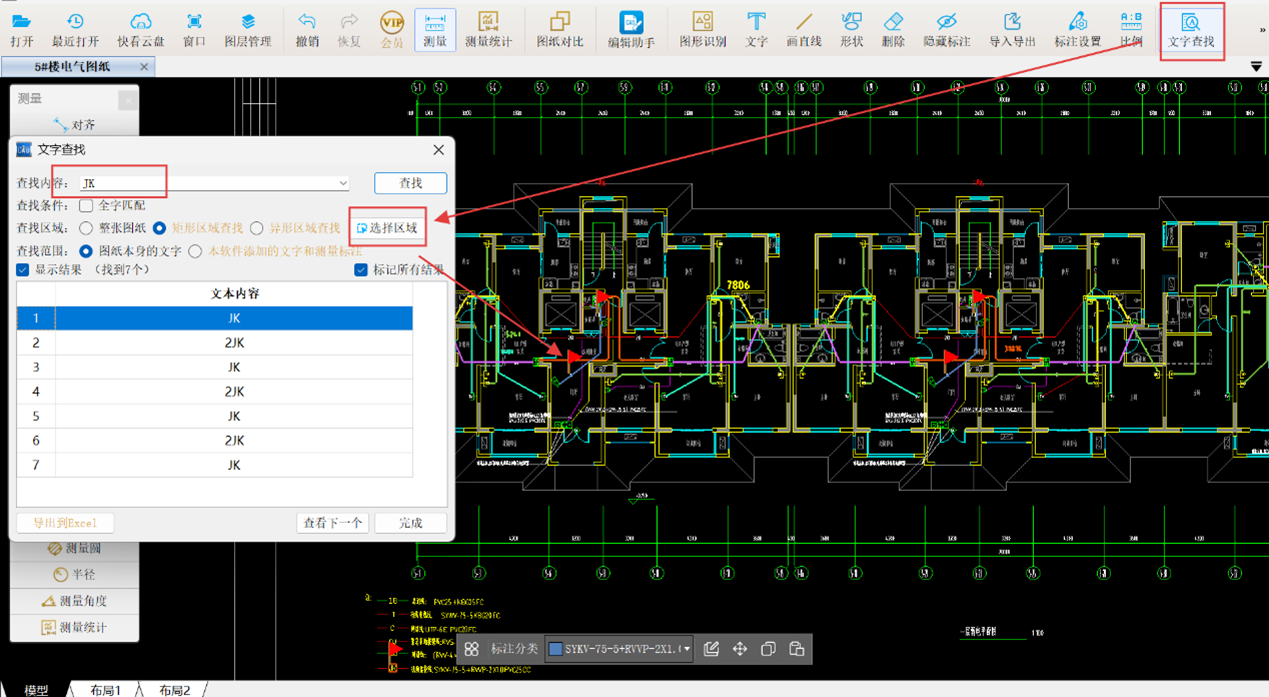 2.由于一层弱电平面图中管线错综复杂,为快速定位视频监控线,可借助CAD快速看图的【文字查找】功能输入“JK”进行查找,查找区域设定为一层弱电平面图,结果将自动标注小红旗。