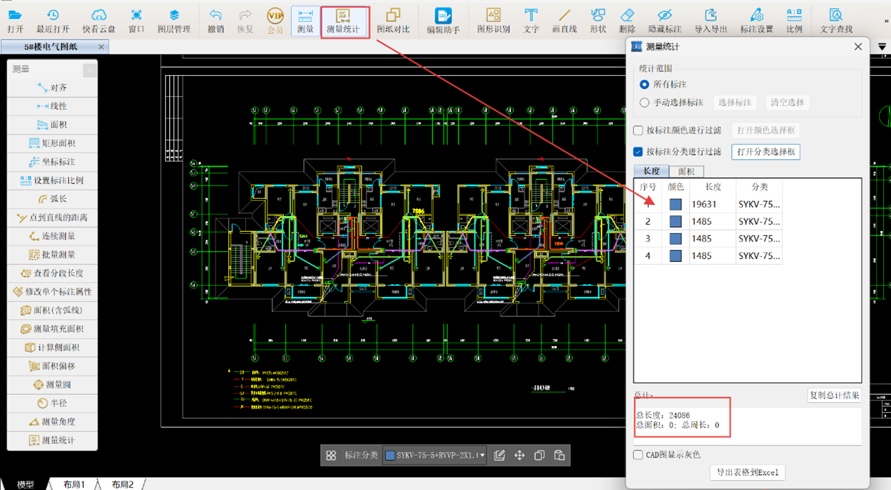 所有视频监控线测量完成后,通过【测量统计】功能按标注分类汇总,如图所示,水平同轴电缆工程量为24.086米。