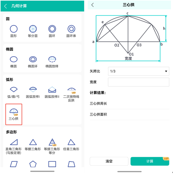 - 三心拱公式:我们提供了不同矢跨比的三心拱计算,三心拱周长和面积的数值一键获取。
