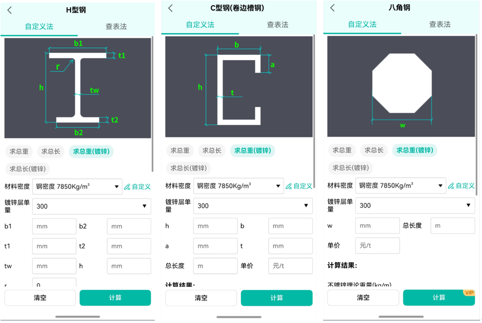 - 增加镀锌tab计算:针对H型钢、C型钢、Z型钢、T型钢、圆钢、等边角钢、不等边角钢、等边卷边角钢、八角钢、六角钢、方钢、扁钢、常用钢板等公式,增加了镀锌情况下的重量和长度计算。