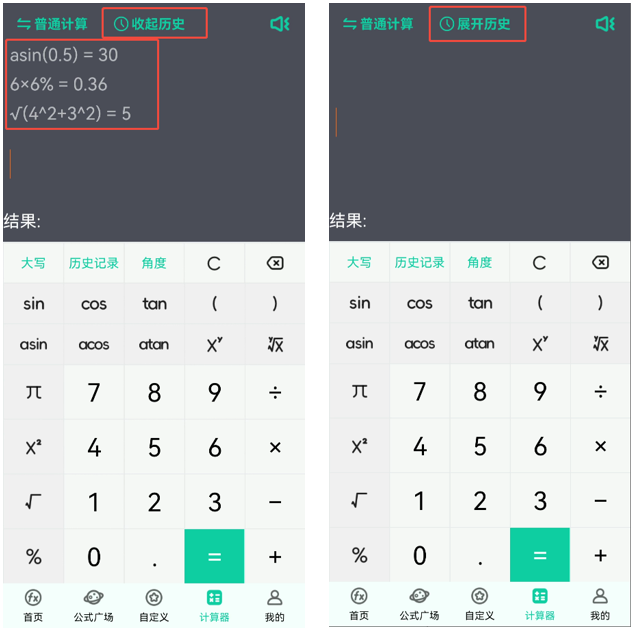 我们为计算器页面新增了历史记录信息的展示,从而能够更加一目了然、直观地看到历史可复用的计算结果。用户还可以通过点击“收起历史”/“展开历史”的按键,从而实现该功能的隐藏与显示。