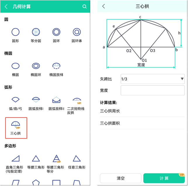 - 三心拱计算:我们为您提供了不同矢跨比情况下的三心拱计算,对于三心拱的周长和面积数据直接计算获得。
